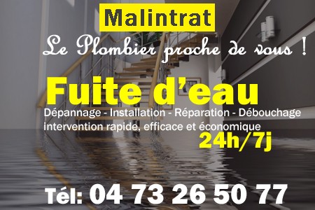 Une fuite d'eau nécessite une intervention urgente car cela augmente votre facture d'eau et risque d'entrainer des dégâts des eaux. C'est pourquoi nous avons mis une équipe d'urgence capable d'intervenir et solutionner le problème dans les plus brefs délais à Malintrat.
